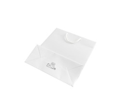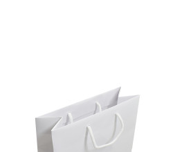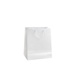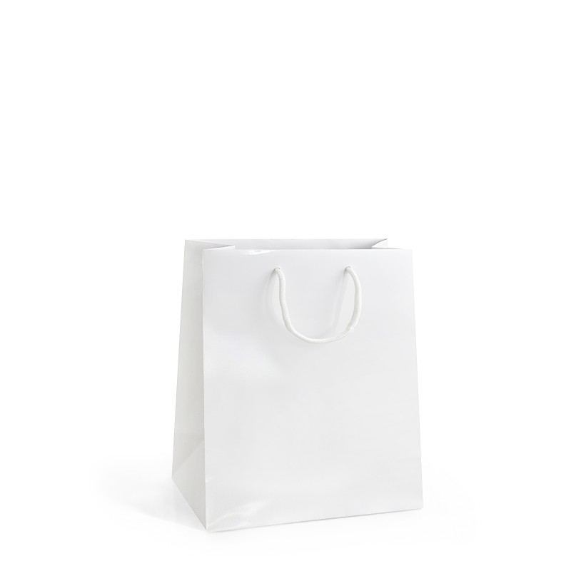 Biela luxusná darčeková taška Milano s lesklou lamináciou a bavlneným uchom. Svojim rozmerom 25x11x31 cm je vhodná pre dokumenty A4, menšie darčeky alebo do luxusných obchodov.