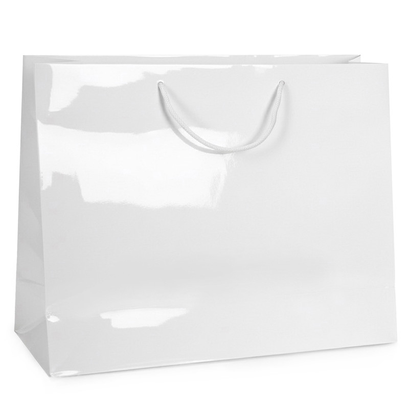 Najväčšia biela darčeková taška z rady Milano, s lesklou lamináciou a bavlneným uchom. Svojím rozmerom 55x14x48 cm je vhodná pre najväčšie darčeky alebo luxusné produkty.