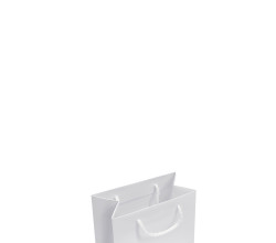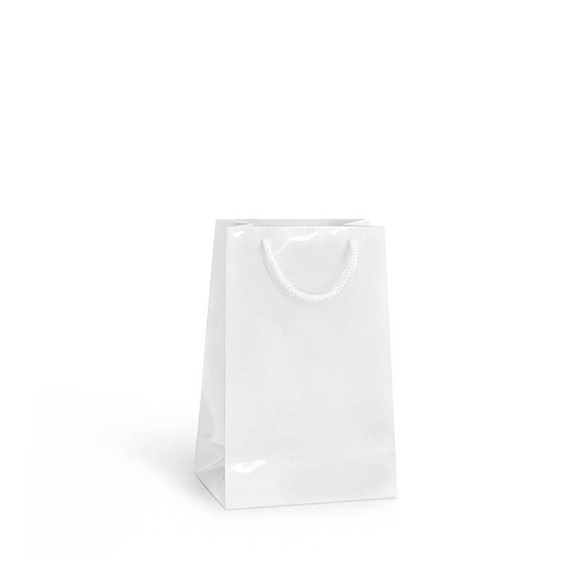 Pevná biela papierová taška Monza s lesklou lamináciou, v rozmere 16x9x28, určená pre menšie darčeky a produkty. Textilné uši ukončené háčikom.