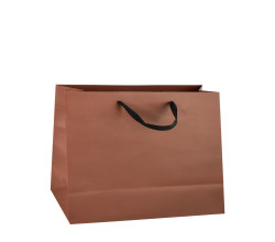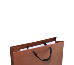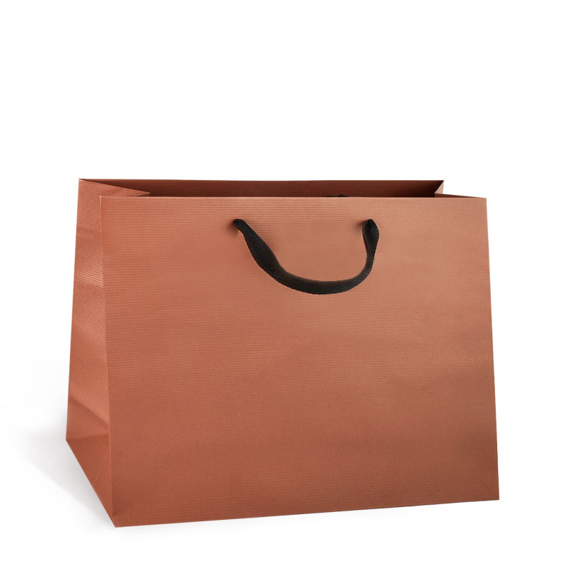 Stredne veľká bordó darčeková taška, s čiernym bavlneným uchom, v rozmere 41x13x31 cm. Taška je vyrobená z pevného ryhovaného, kraftového papiera, vhodná na väčšie darčeky.