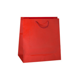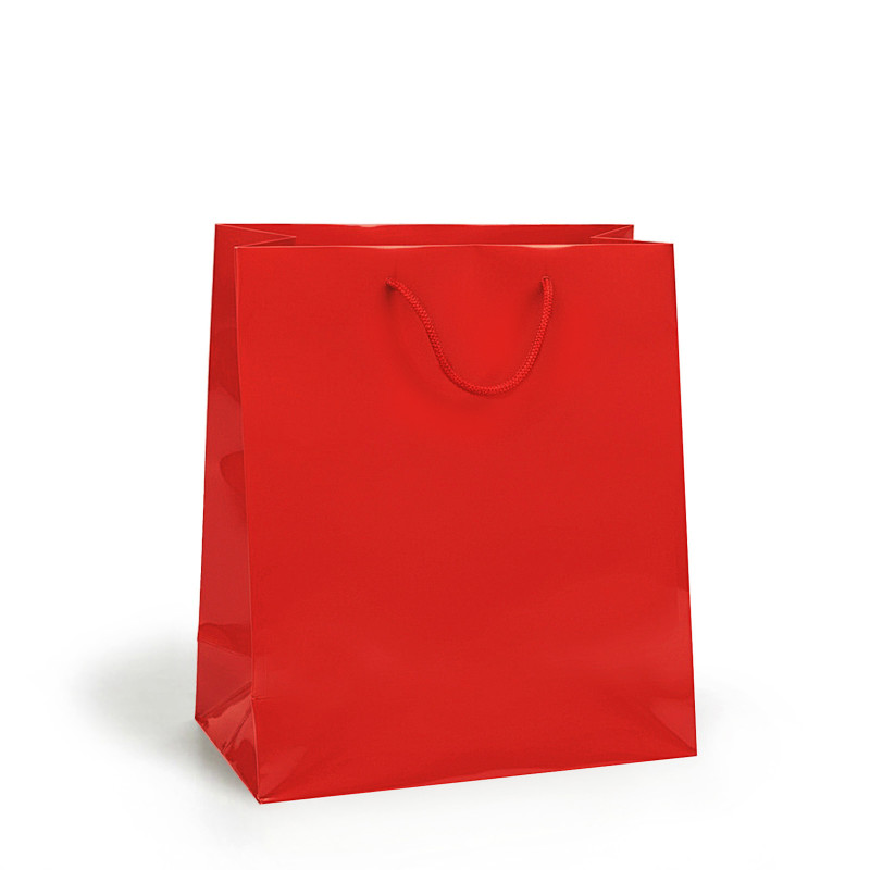Väčšia červená luxusná darčeková taška Milano, v lesklom prevedení, s bavlneným uchom a rozmerom 36x12x40 cm. Vhodná pre objemnejšie darčeky a produkty, vrátane ťažších vecí.