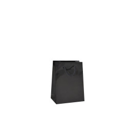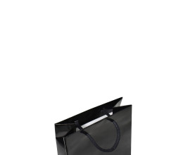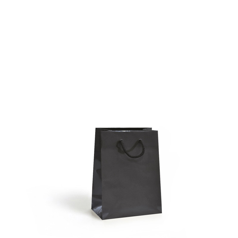 Luxusná čierna darčeková taška Milano s lesklou lamináciou a bavlneným uchom v rozmere 16x8x24 cm. Taška je vhodná pre drobné darčeky alebo pre obchody s luxusnými doplnkami.
