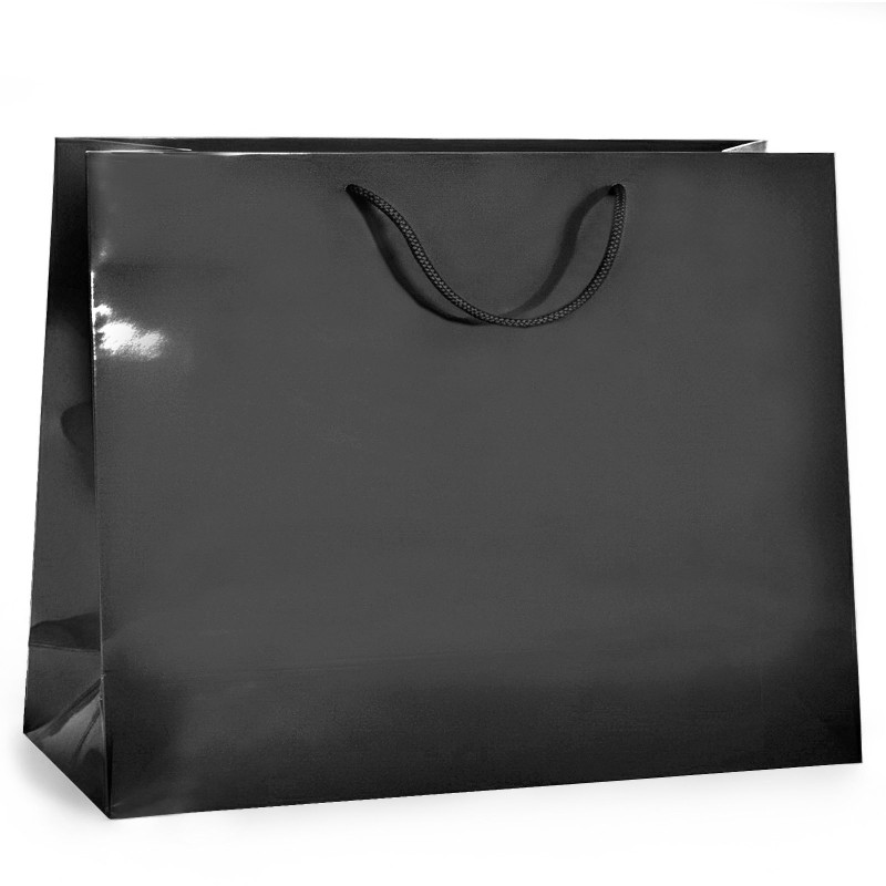 Najväčšia čierna darčeková taška z rady Milano, s lesklou lamináciou a bavlneným uchom. Svojím rozmerom 55x14x48 cm je vhodná pre najväčšie darčeky alebo luxusné produkty.