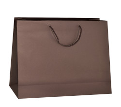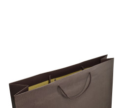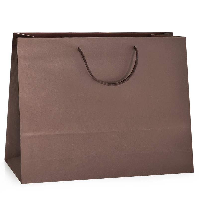 Najväčšia hnedá darčeková taška Brown v rozmere 55x14x43 cm. Taška je vyrobená z ryhovaného papiera, ucha hnedá bavlnená. Vhodná pre veľké predmety alebo sadu darčekov.