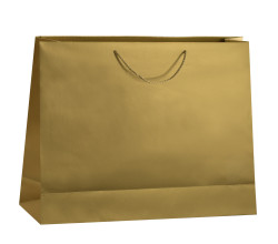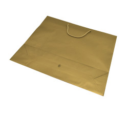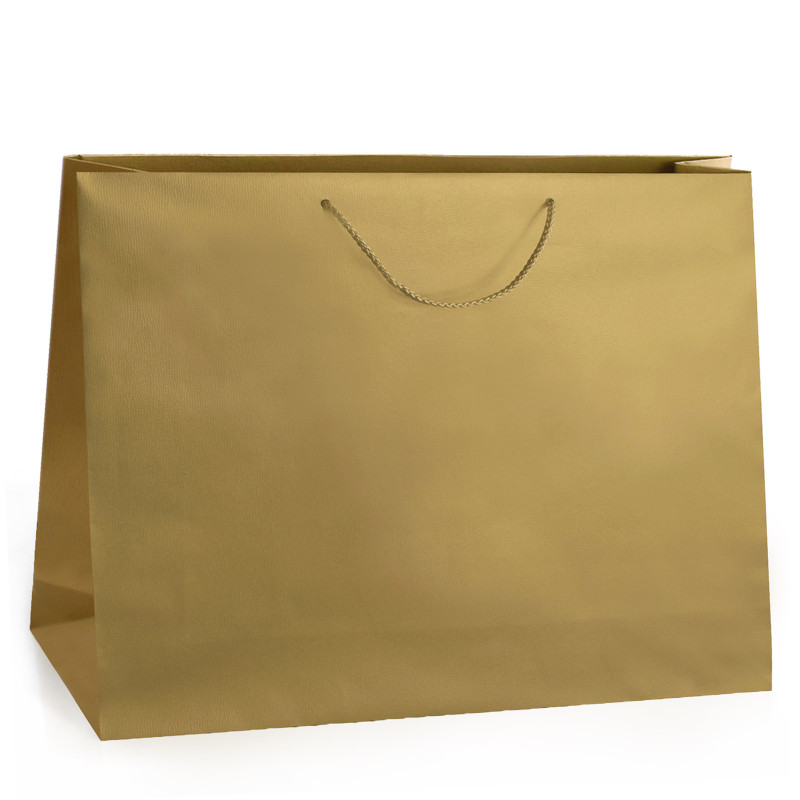 Najväčšia zlatá, luxusná, darčeková taška Gold v rozmere 54x14x45 cm. Je vyrobená zo štrukturovaného papiera a má zlaté uši z pletených šnúrok.