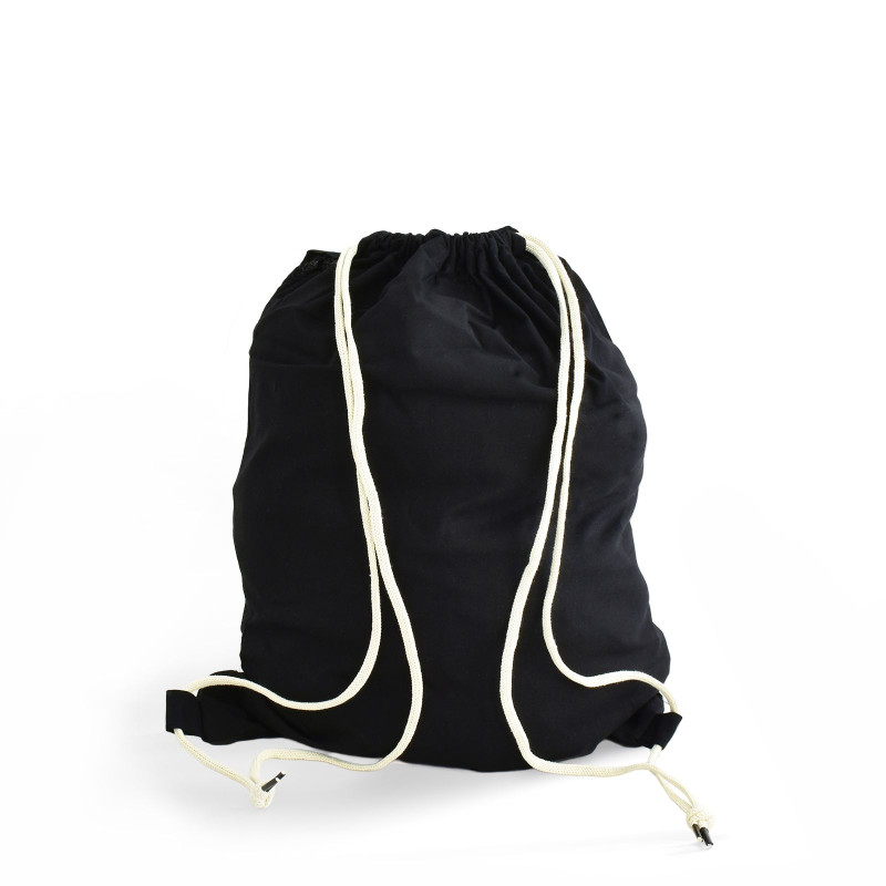 Detský čierny bavlnený vak v rozmere 37x46 cm, vyrobený zo 100 % bavlny, so sťahovacími šnúrkami.
