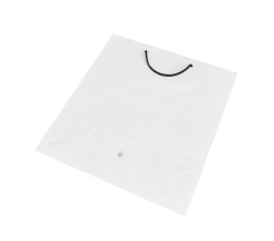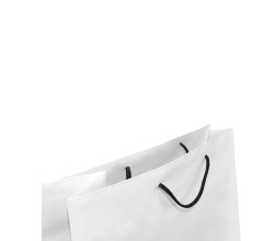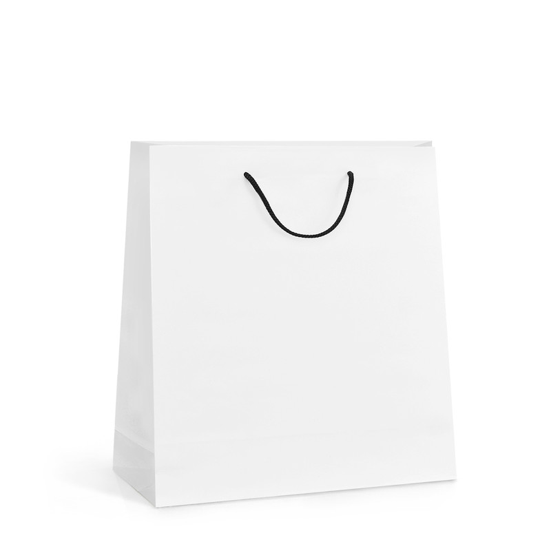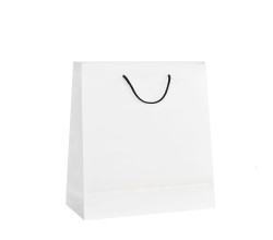 Stredne veľká EKO luxusná biela kraftová taška Napoli z papiera 150g s čiernym textilným uchom. Konce ucha sú riešené štýlovo plastovým háčikom namiesto uzlov. Svojím rozmerom 36x12x38,5 cm je vhodná pre objemnejšie darčeky a produkty.